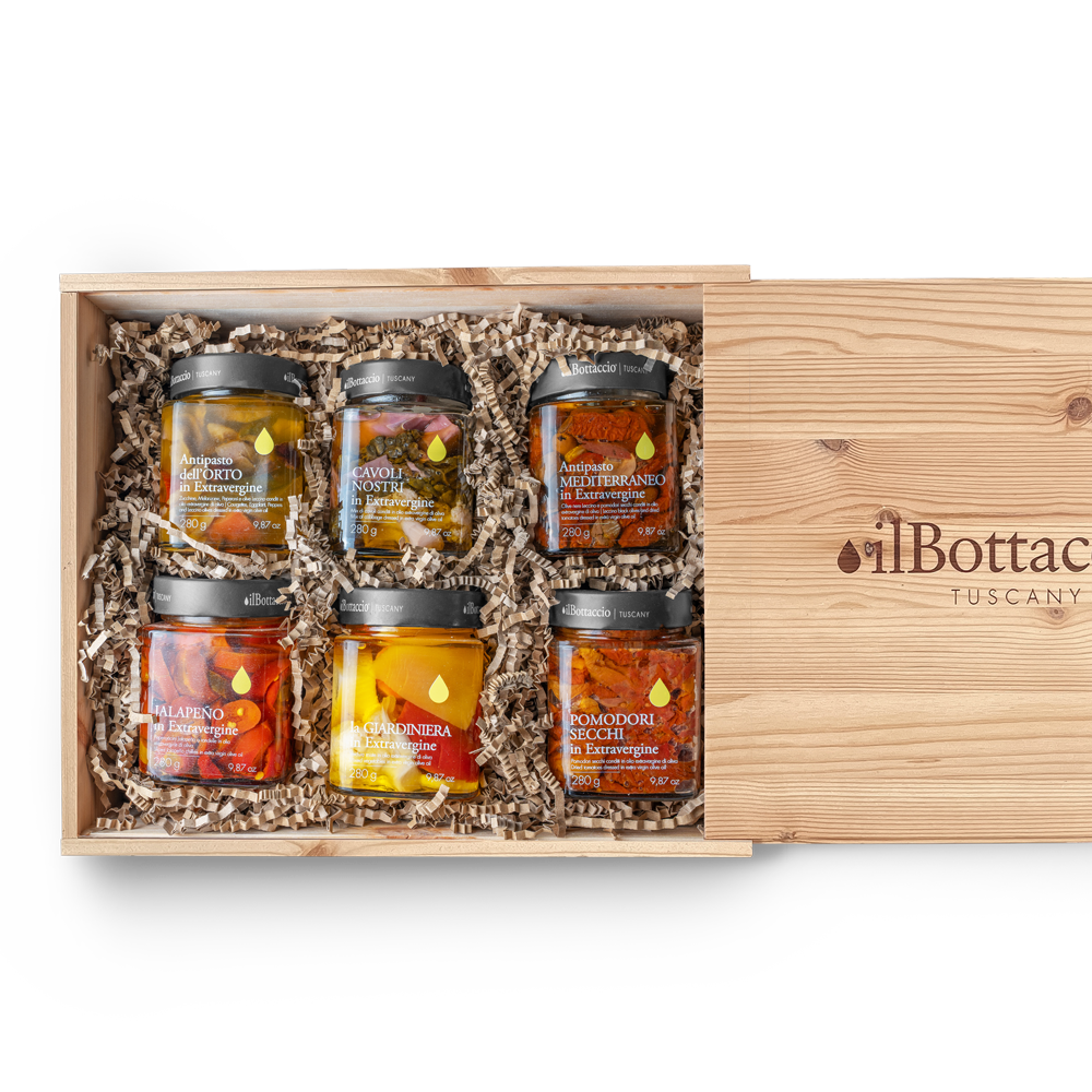 Description: Gourmet wooden gift set featuring a selection of exquisite preserved vegetables preserved in extra virgin olive oil. These preserved vegetables, made with high-quality ingredients and artisanal craftsmanship, offer a combination of intense and authentic flavors. Enjoy the sun-dried tomatoes, the pickled vegetables, the cauliflower, and other vegetables, immersed in extra virgin olive oil that enhances their flavors and gives them a succulent texture. Ideal for enhancing appetizers, pasta dishes, salads, or creating delicious gourmet sandwiches. A perfect gourmet gift for those who appreciate Mediterranean flavors and want to experience the taste of high-quality vegetables in oil.
